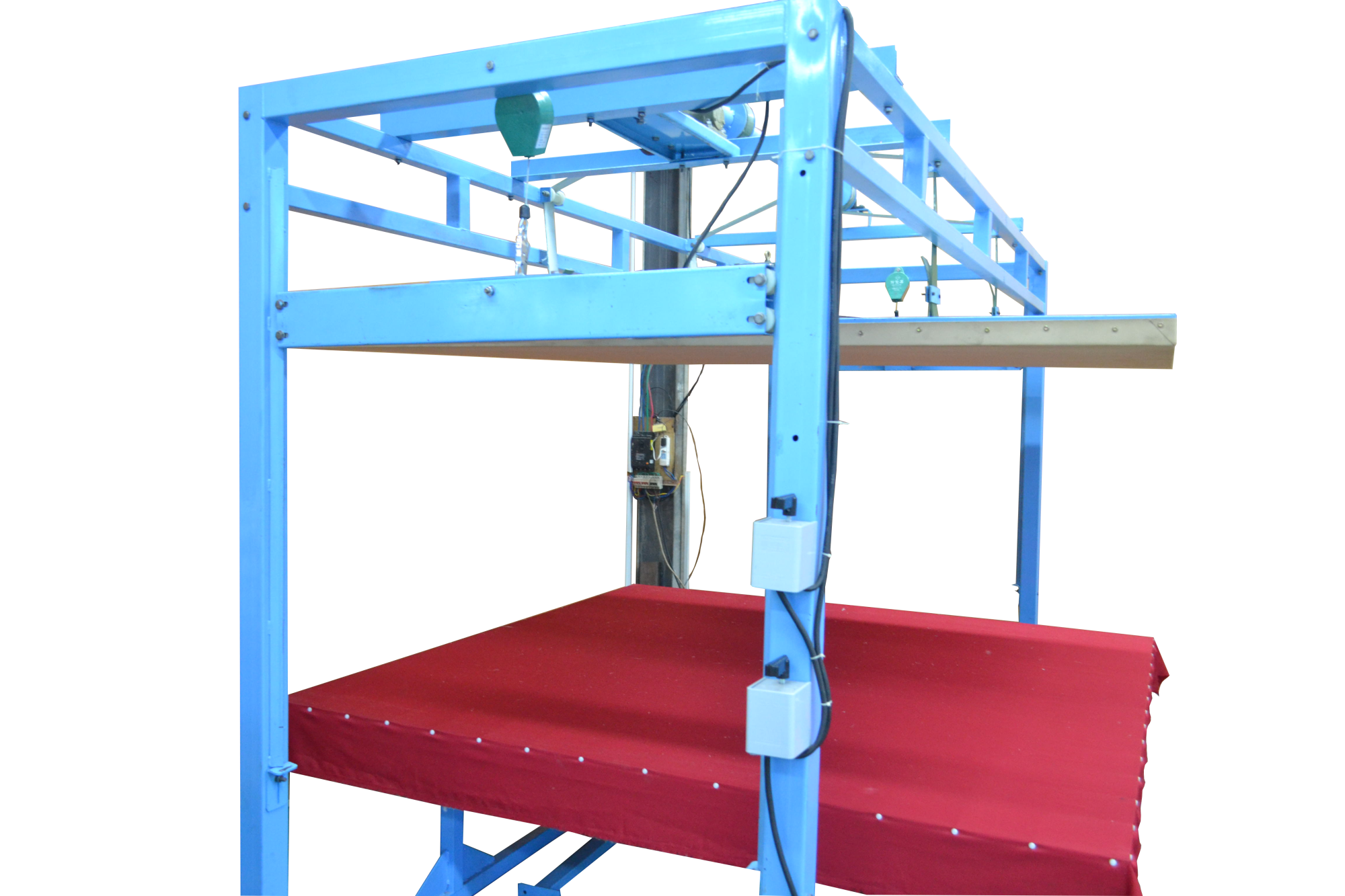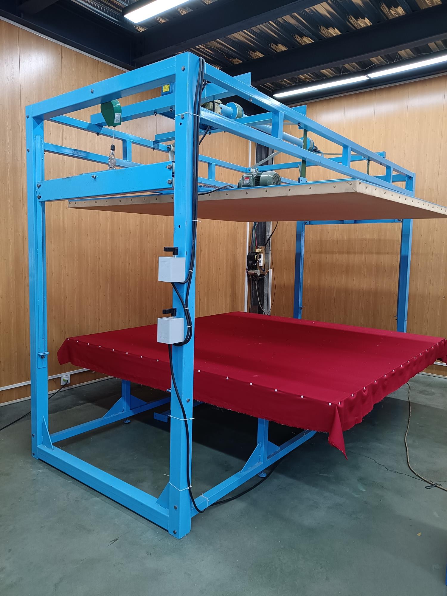 本全自動揉棉機為徽星機械機械制造有限公司研發新型產品,該全自動揉棉機由傳統的上傳動方式,改為下傳動方式。上傳動全自動揉棉機的主要缺點是噪音高,振動副度比較大,安裝時要配合地錨來固定機器,本新型機器(全自動揉棉機)的下傳動裝置改變了以上的缺點。新一代全自動揉棉機(揉磨機)操作方便,易于使用。適用于棉胎成型加工廠、踏花被廠、棉胎加工個體戶使用;全自動揉棉機揉制的棉胎(絮)平整、美觀、結實、耐用,全自動揉棉機(揉磨機)使傳統的人工強體力勞動變為本系列機器的自動化機械作業,特別是自動升降系統和定時揉棉設定,大大減輕了工人的勞動強度、提高了勞動效率。并且一人可看管多機,效益非常顯著。全自動揉棉機其原理是電機帶動偏心運轉使上揉板運動,將棉鋪磨平、壓緊,使棉纖維與網線結合,成型棉胎。